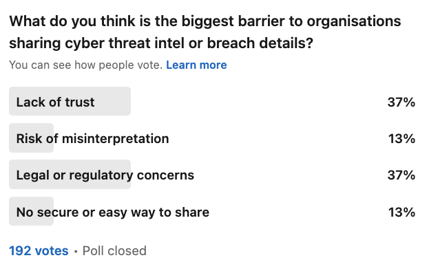 Ask yourself this question: why are hackers often more effective at collaboration than the organisations they’re targeting? This was something I did a week ago via a poll, and you can see the results here.